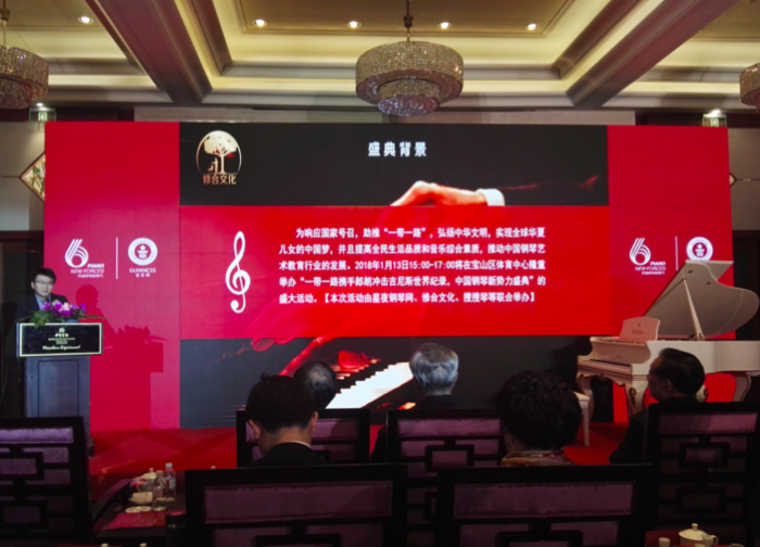 CCTV证券资讯频道城市 网19日报道(图/文 陶金)为积极响应国家号召,助推 “一带一路”政策,弘扬中华文明精神, 实现全球华夏儿女的 梦,推动 钢琴艺术教育行业的发展,2017年11月16日“星夜钢琴携手郎朗冲击吉尼斯世界纪录暨 钢琴新势力盛典”启动仪式在上海长宁区西郊宾馆隆重举办。本次 钢琴新势力盛典启动仪式由星夜钢琴网、搜搜琴、修合文化主办,新华小记者活动组织委员会、深圳易赛天下科技有限公司、艺商会、 健康文化产业投资集团有限公司、刘伟拥抱基金等联合主办,以及20余家企业联合发起,由星夜钢琴(控股)集团董事长曾纪贵及修合文化总裁周韬作为总发起人联合各界代表共同推动此次发布会盛大召开。