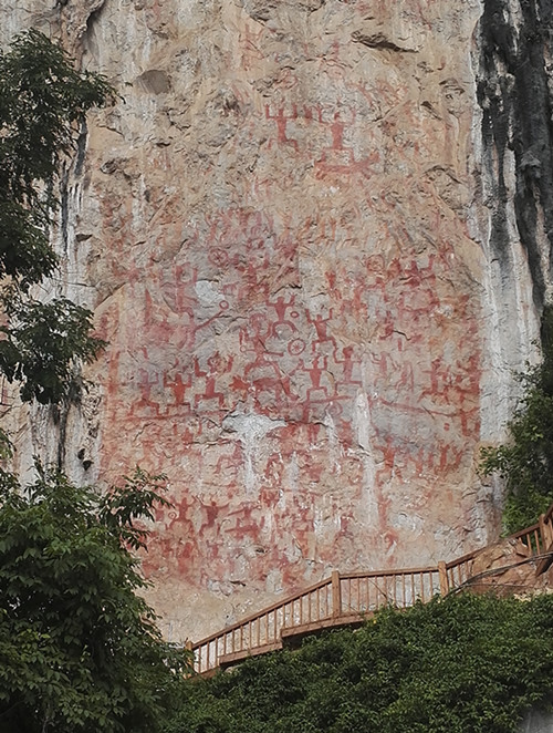 花山岩画是左江流域岩画群的代表,也是目前为止 发现的单体最大、内容最丰富、保存最完好的一处岩画。位于宁明县城中镇耀达村明江西岸,是战国至东汉时期岭南左江流域壮族先民骆越人巫术活动遗留下来的遗迹、国内外著名的古代涂绘类岩画点,至今已有1800—2500年的历史,以规模宏大,场面壮观,图像众多,成为广西左江流域岩画的典型代表而闻名于世。2016年7月15日,在土耳其伊斯坦布尔举行的联合国教科文组织世界遗产委员会第40届会议上, 世界文化遗产提名项目“左江花山岩画文化景观”入选《世界遗产名录》,成为 第49处世界遗产。